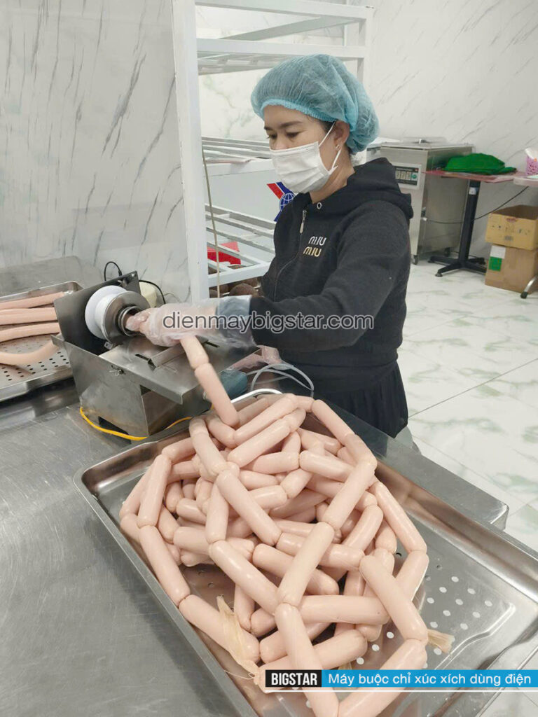 Sau khi được đùn thành dải xúc xích dài, máy buộc chỉ xúc xích sẽ chia dải này thành từng chiếc xúc xích có độ dài tiêu chuẩn bằng cách buộc chỉ tự động. Máy thực hiện công đoạn buộc chỉ nhanh chóng và chính xác, tạo ra các sản phẩm đồng đều về kích thước và có tính thẩm mỹ cao. Nhờ đó, người dùng có thể giảm thiểu nhân công và nâng cao tính chuyên nghiệp của xúc xích trước khi đưa ra thị trường.