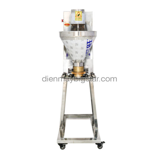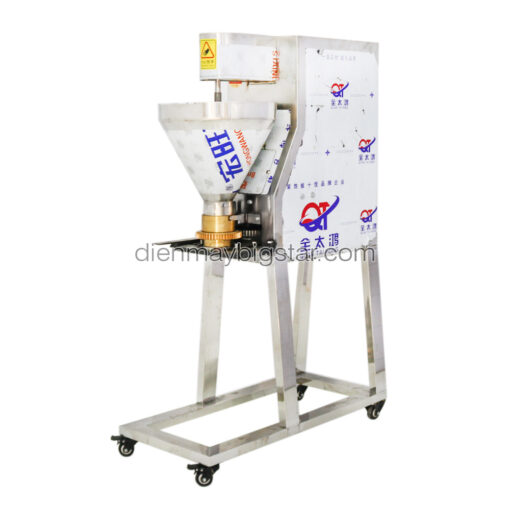 Cối đùn và phễu chứa nguyên liệu có dung tích lớn để chứa lượng thịt xay nhuyễn cho mỗi mẻ. Thiết kế này giúp quá trình cấp liệu diễn ra liên tục và hiệu quả, từ đó tối ưu năng suất làm ra các viên thịt to tròn đồng đều.